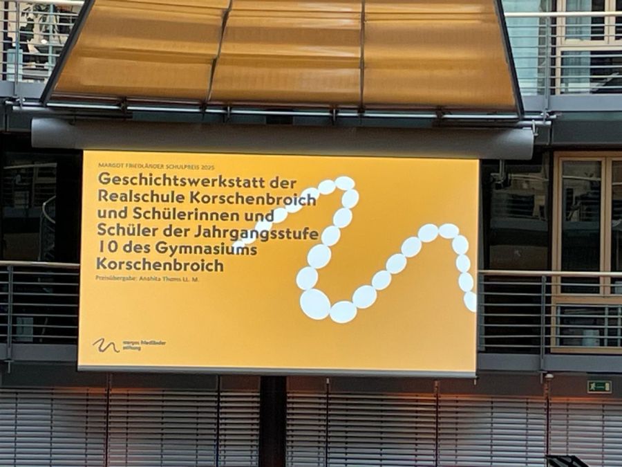 Unser Gymnasium Korschenbroich hat in Kooperation mit der Realschule Korschenbroich den Margot Friedländer Schulpreis 2025 für die Aktionen rund um den 9. November erhalten!